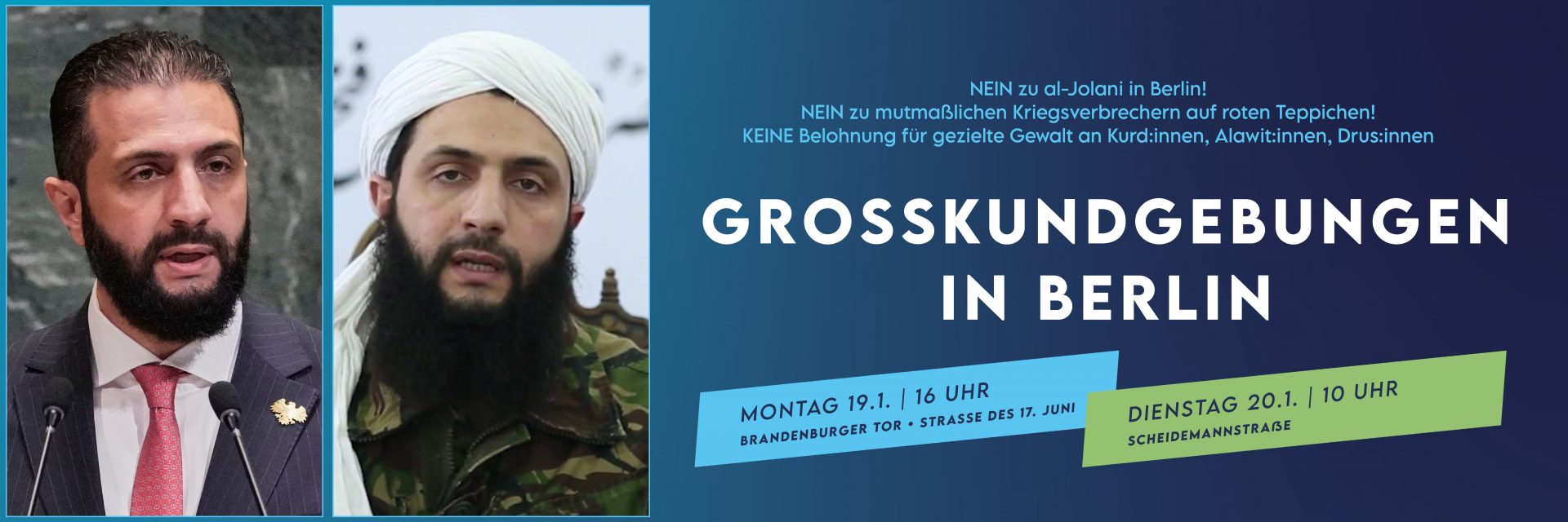 NEIN zu al-Jolani in Berlin! NEIN zu mutmaßlichen Kriegsverbrechern auf roten Teppichen! KEINE Belohnung für Gewalt an Kurd:innen, Jesid:innen, Alawit:innen, Drus:innen! Solidarität mit Rojava!