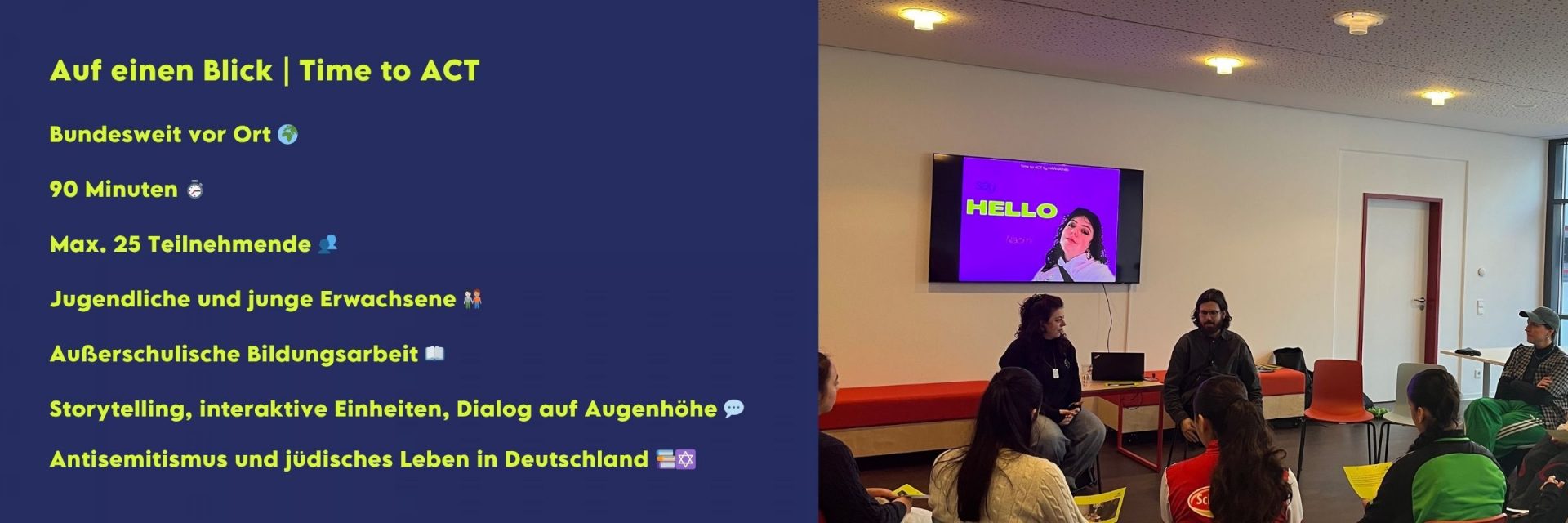 Der 90-minütige Time to ACT-Workshop sensibilisiert Jugendliche für die Aktualität, Vielschichtigkeit und Kontinuität von Antisemitismus. Durch den Dialog mit Betroffenen antisemitischer Gewalt wird eine emotionale Verbindung geschaffen, die Verständnis und Empathie fördert.