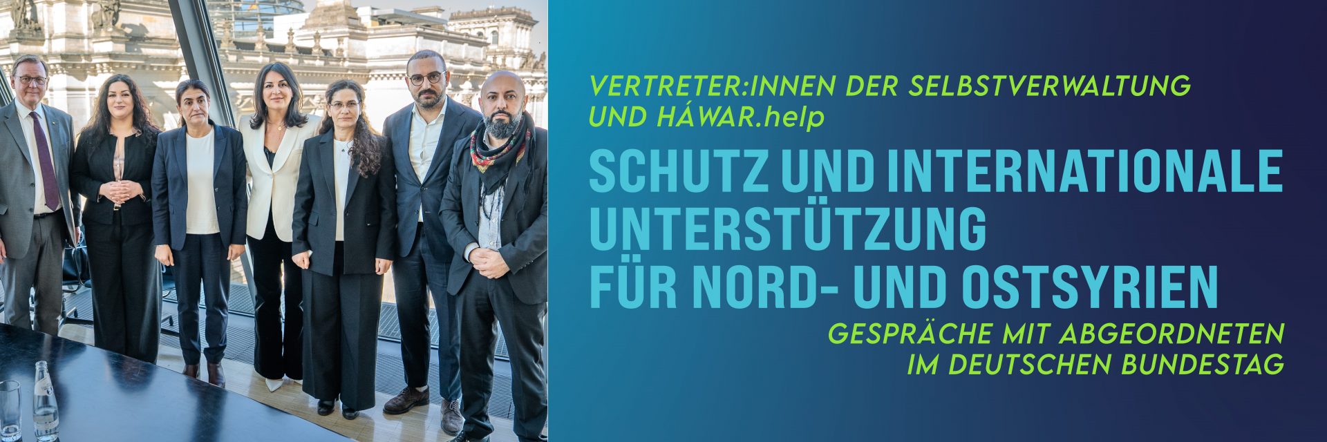 Unser besonderer Dank gilt Bodo Ramelow und Cansu Özdemir, die diesen Austausch gemeinsam mit HÁWAR.help ermöglicht haben. Wir danken ebenso allen anwesenden Bundestagsabgeordneten sowie den Vertreter:innen der Selbstverwaltung für die offenen Gespräche, die Bereitschaft zum Dialog und die gemeinsame Verantwortung für eine demokratische und inklusive Zukunft in Nord- und Ostsyrien.